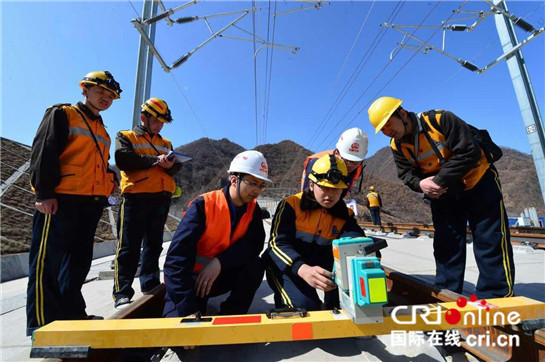 3月1日,在宝兰高铁陕西段庵平东沟大桥上,作业人员正在对高铁供电设备进行测量、检调、试验。(唐振江 摄)