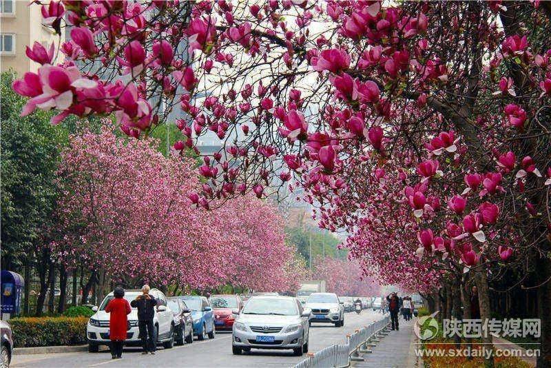 随着一场春雨的到来,3月15日,西安市高新区高新一路两旁的紫玉兰花竞相绽放,使得高新一路变成了街边最美的一条风景线,也被不少人称为“玉兰花一条街”。(陕西日报记者 安涛 实习生 柯希飞摄)