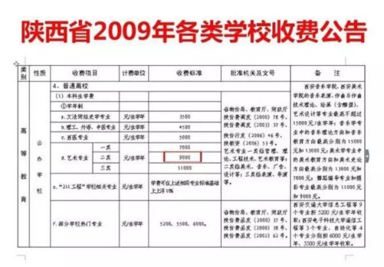 此外,国际在线陕西频道在陕西省物价局官网查阅了2010年、2011年、2012年及2013年的公办院校艺术类专业收费标准,国家规定艺术专业二类收费标准为9000元/生学年。