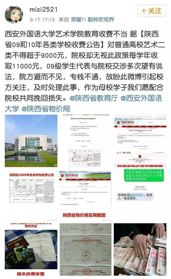 该网友发布了西安外国语大学艺术学院影动画专业历年缴纳学费和住宿费凭据,凭据显示该专业每学年学费为11000元。然而,该网友质疑称,根据陕西省物价局2009年8月27日公布的《陕西省2009年秋季各级各类学校收费一览表》显示,该专业学费应为每学年9000元。