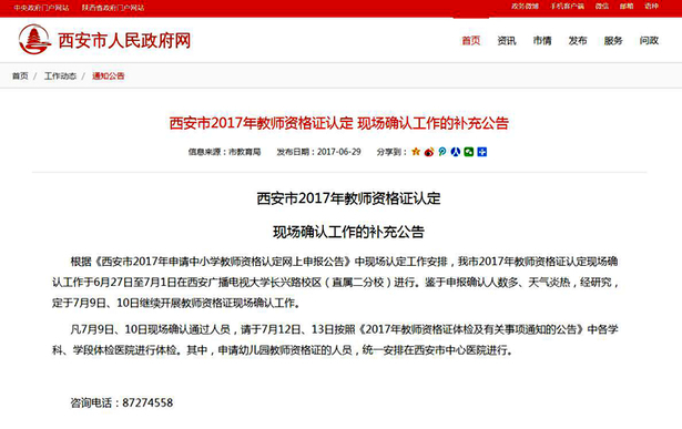 今天中午,西安市教师资格认定工作领导小组办公室发布《西安市2017年教师资格证认定现场确认工作的补充公告》,公告中称,根据安排,西安市2017年教师资格证认定现场确认工作于6月27日至7月1日在西安广播电视大学长兴路校区(直属二分校)进行。鉴于申报确认人数多、天气炎热,经研究,定于7月9日、10日继续开展教师资格证现场确认工作。