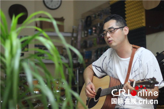 国际在线陕西频道消息:调好琴弦试好音,抱起心爱的吉他,28岁的丁哲扶了扶面前的立杆话筒,唱起了他最喜欢的一首《有没有人告诉你》:有没有人告诉你,我很爱你,有没有人在你日记里哭泣…… 跳动的音符再现着民谣特有的画面感,一曲结束,好长时间,丁哲还沉浸在音乐的世界里不能自拔,“能唱歌给更多的人听,对我来说就是一件很开心的事情。” 擦了擦吉他丁哲笑着说道。