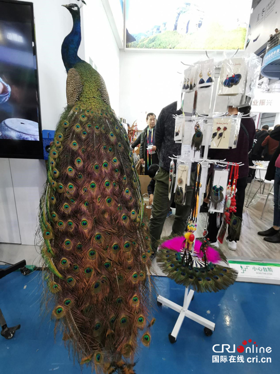 在陕西省妇女联合会展位和铜川市耀州区展位,由蓝孔雀羽毛制成的工艺品和蓝孔雀标本旁,聚集了许多前来参观的嘉宾和观众。孔雀羽毛饰品、扇子、画,孔雀蛋……铜川市耀州区关庄镇道东村吕村组孔雀养殖基地负责人张艳向每位来咨询的客人讲解着展品的详情。