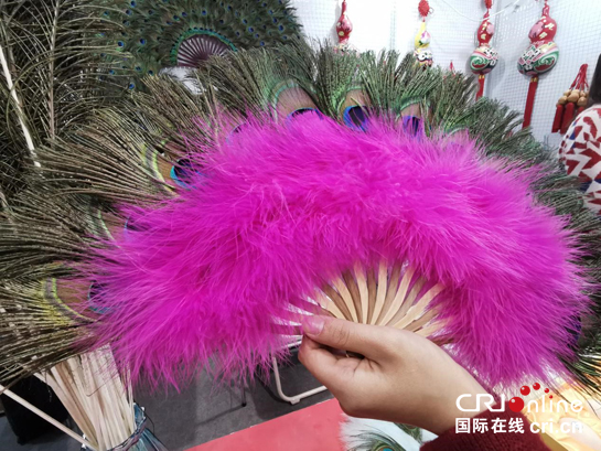 陕西省妇女联合会展位展出的孔雀羽毛扇子 摄影 陈锵