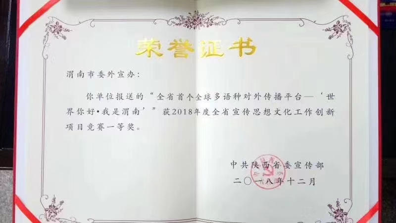 “世界你好 我是渭南”全球多语种传播平台荣获2018年全省宣传思想文化创新项目竞赛一等奖