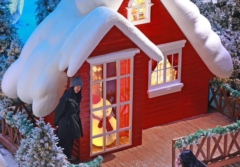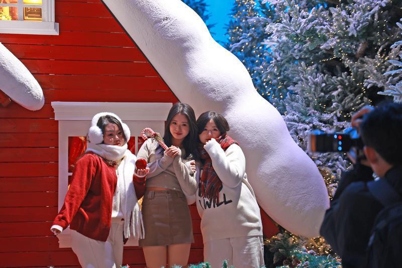 簌簌飘落的人造雪花铺满角落,覆着白霜的松树缀满彩灯,冰蓝色的喷泉仿佛被“冻”在冬日里,晶莹冰棱垂挂而下;红色小木屋顶上厚厚的人造白雪,瞬间勾勒出北国雪乡的治愈氛围。