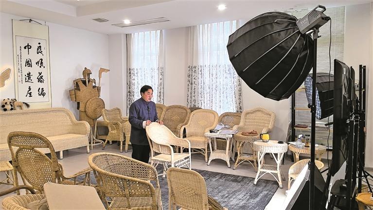 2月26日,在汉中藤编良顺新媒体运营中心,汉中藤编国家级代表性传承人陈良顺正在直播。只见他对着镜头热情地介绍着藤椅,不时与观众互动。