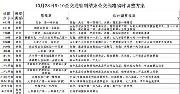 10月28日6:10至交通管制结束公交线路临时调整方案