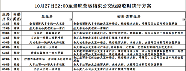 10月27日22:00至当晚营运结束公交线路临时绕行方案