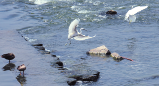 7月29日,在西安市灞渭湿地,一簇簇水草布满河滩,白鹭、白鹤、斑嘴鸭,时而追逐嬉闹,时而结伴觅食,好不惬意。(记者 袁景智摄)