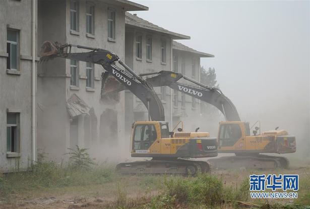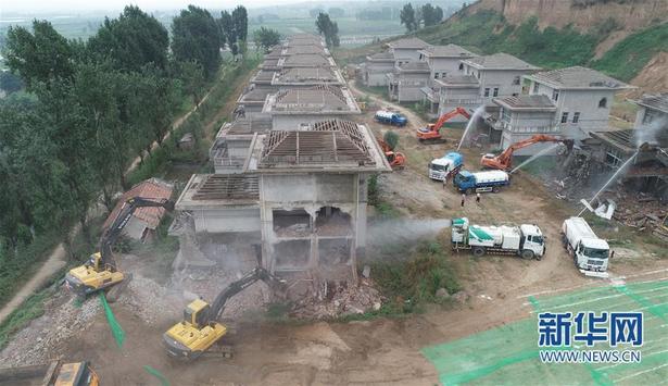 8月14日,大型机械对西安市鄠邑区蒋村镇的违建别墅进行拆除(无人机拍摄)。 新华社记者 邵瑞 摄