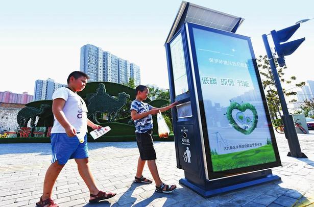 八月二十八日,在西安市大兴新区纬二十九街与光明路十字,学生向智能环保型保洁箱扔垃圾。最近,西安市大兴新区梨园路、纬二十九街等处尝试性投放的八十八台太阳能智能环保型保洁箱,因为具有夜间照明亮化控制、共享手机充电、杀菌除臭等功能,受到市民好评。记者袁景智摄