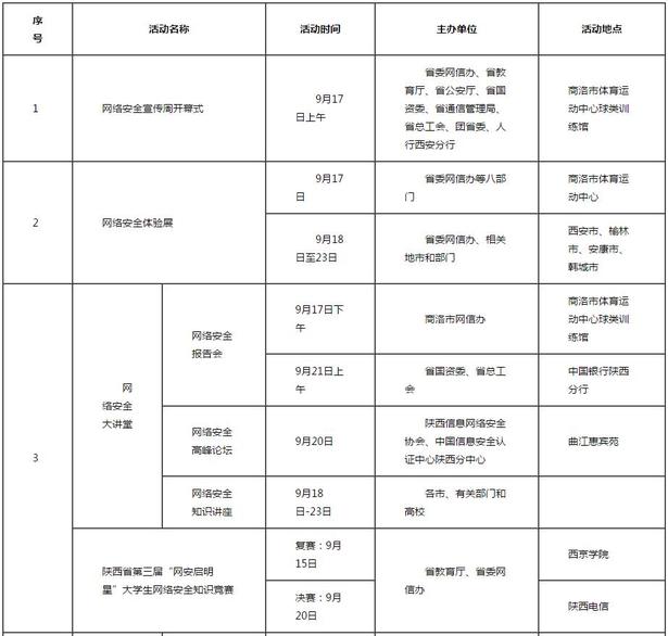 9月17日上午,2018年陕西省第五届国家网络安全宣传周开幕式将在商洛市举行,届时还将举办网络安全体验展,主要展示网络安全新成就新应用新技能,宣传普及网络安全知识和技能。