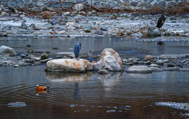黑鹳和苍鹭、赤麻鸭在一起。 通讯员 赵建强摄