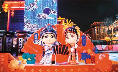 从大年初一起,唐玄宗与杨贵妃、玄奘和白龙马、王宝钏和薛平贵三组秦腔动漫人物便屹立在大唐不夜城·现代唐人街上。这三组看起来憨态可掬、喜庆十足的秦腔动漫人物,立刻在市民游客中走红,成为这条步行街上最具秦文化特色、最引人瞩目的景观之一。尤其是孩子们,争相跟“禅礼”雕塑中萌版的白龙马、唐玄奘合影。萌萌的玄奘身披袈裟,与白龙马相伴,凝望远方,像是历尽艰难终于取回真经,在灯火中显得肃穆而又虔诚。大雁塔下千年前真实发生过的故事,通过这样接地气的方式表现在街头,引得市民游人交口称赞。秦腔名段《五典坡》中王宝钏与薛平贵的故事就发生在不远处的寒窑,一直被陕西戏迷们津津乐道,而“情比金坚”雕塑展示的就是王宝钏与薛平贵夫妇团圆,《大登殿》一折的景象。“龙凤呈祥”雕塑主人公唐明皇与杨贵妃参考了秦腔服饰的设计风格,贵妃傲娇,玄宗霸气。彰显古都西安自信、开放包容、大气的城市气质。