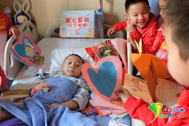 由于洋洋还处于恢复期,不方便大量学生进病房探望。3月17日,B7班8名学生代表带着全班同学的祝福,在家长的陪伴下来到红会医院。当鲜花、手折的千纸鹤、爱心卡、书籍、糖果、牛奶等礼物送到洋洋身边,当同龄人轻轻拉着洋洋的手给他送上鼓励的话语……原本不说话的洋洋变得活跃起来。