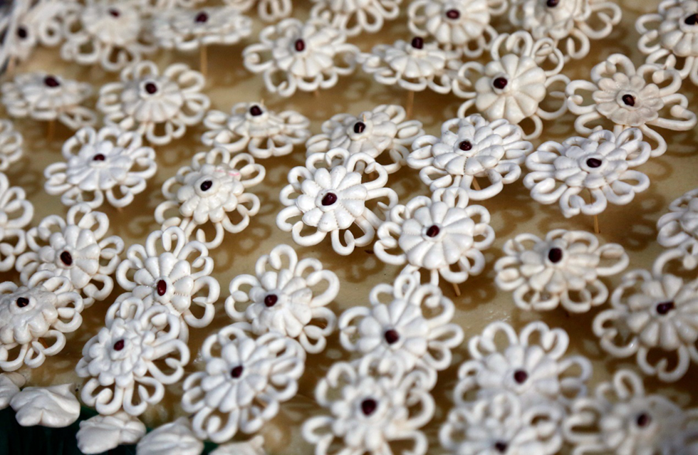华州面花的代表作品有“谷卷”和“高馍盘”,都是大型的组合体。“谷卷”的形体是虎头,龙身,凤尾,远观似虎,近看变化无穷。“高馍盘”多用于婚礼喜庆场面,高丈余,重百斤,一般为七层。一层“水担”馍,喻百年良缘;二层蝙蝠,三层桃果,喻福寿双全;四层游鱼,五层莲花,喻夫妻恩爱;六层凤凰,七层牡丹,喻富贵如意;顶端多为“莲生贵子”或“龙凤呈祥”。华州面花2009年被列入第二批陕西省非物质文化遗产名录。(来源:渭南市委宣传部)