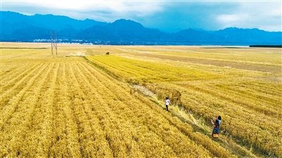 6月2日,在神禾塬上,数万亩小麦连片成熟,金色的麦浪与蓝天、白云和秦岭组成了一幅丰收的画面。