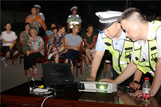 国际在线陕西消息:2019年8月15日下午,陕西省渭南市公安局交警支队临渭大队民警,架起投影仪,为村民播放警示教育电影。