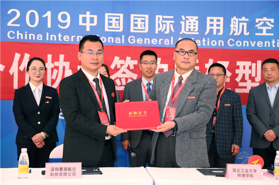 国际在线陕西报道(冯妍):10月18日,在陕西蒲城内府机场举行的2019中国国际通用航空大会飞行表演期间,西北工业大学明德学院与深圳墨菲航空科技有限公司举办了合作协议签约暨轻型飞机捐赠仪式。由中国大学生自制飞机第一人陈墨创办的深圳墨菲航空科技有限公司与西北工业大学明德学院签署校企合作协议,陈墨向母校西北工业大学明德学院捐赠超轻型固定翼载人飞机一架。