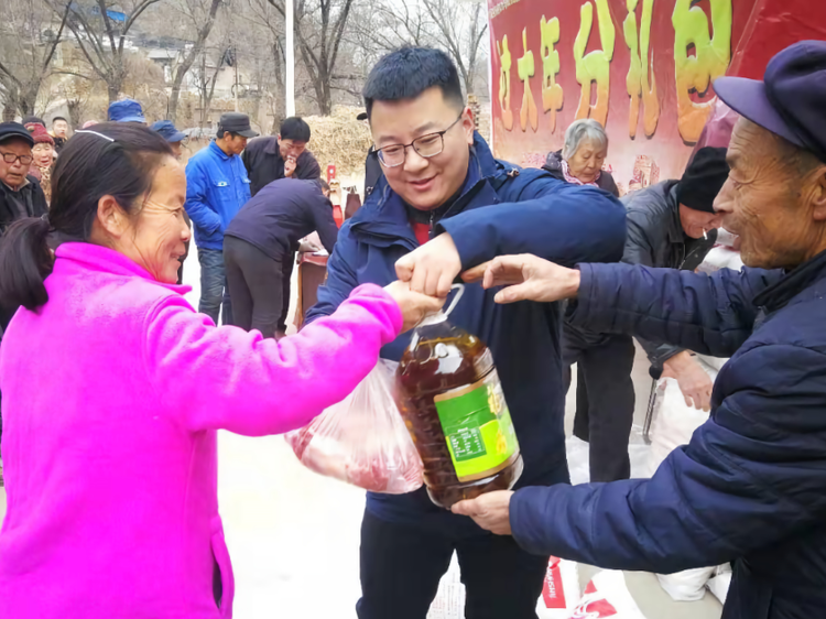 杨柏巽(中)为村民发放分红物资 供图 国网陕西省电力公司
