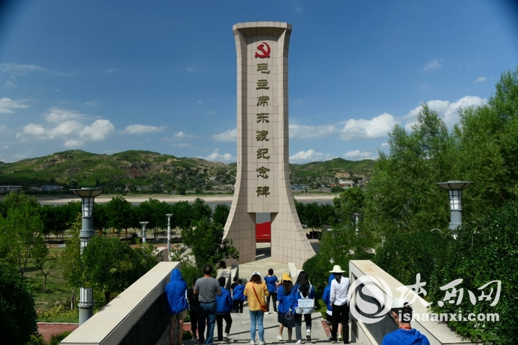 烈日当空,毛主席东渡纪念碑高高矗立在黄河岸边,站在碑下眺望,黄河水奔流而下,山峦嶙峋巍峨。记者团跟随讲解员来到毛主席东渡黄河纪念公园,16块毛主席转战陕北浮雕、毛主席东渡黄河雕塑生动再现了毛主席东渡黄河的情景。