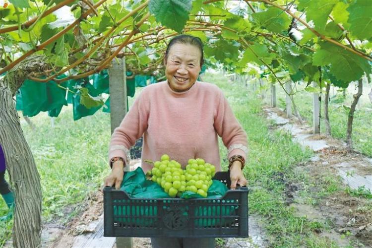 9月19日,在合阳县添缘现代农业有限责任公司,工作人员端着刚采摘的葡萄,喜笑颜开(资料照片)。 陕西日报记者 耿杨洋 摄