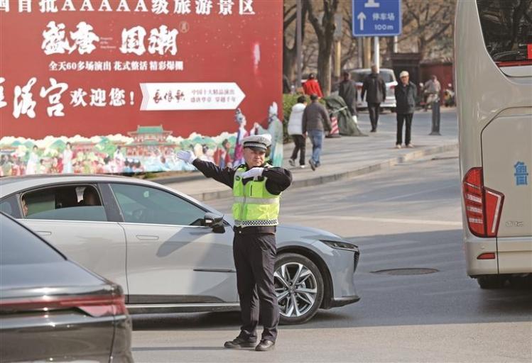 2月22日,在西安市临潼区华清宫景区附近的秦唐大道和牡丹路十字,交警在指挥交通。陕西日报通讯员 王三合 摄